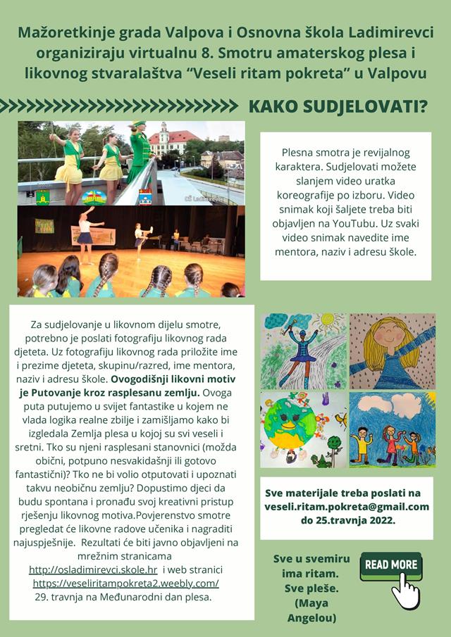 Na internetskoj stranici OŠ Ladimirevci http://os-ladimirevci.skole.hr/ i na stranici smotre "Veseli ritam pokreta" https://veseliritampokreta2.weebly.com/ na sam Međunarodni dan plesa, 29. travnja 2022. godine bit će javno objavljeni rezultati likovnog natječaja. Svi plesni i likovni uradci također će biti objavljeni na već spomenutoj stranici smotre.