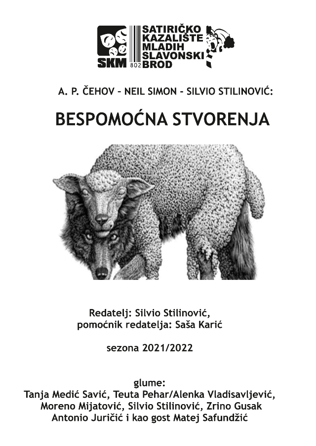 BELIŠĆE U petak, 25. ožujka 2022., s početkom u 20 sati, na programu 42. dramskog memorijala Dragutina Merca Nunoša i Ivana Nikolnikova Vanje, Satiričko kazalište mladih iz Slavonskoga Broda izvest će predstavu „Bespomoćna stvorenja”.