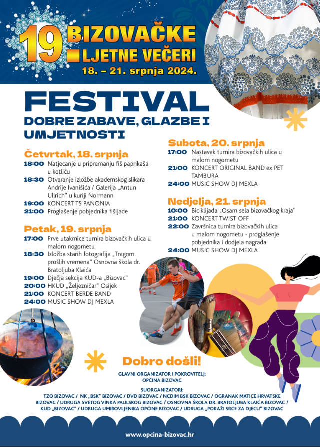 U bizovačkoj likovnoj galeriji „Antun Ullrich“ bit će postavljena likovna izložba akademskog slikara Andrije Ivanišića, a u predvorju Osnovne škole dr. „Bratoljuba Klaića“ održat će se neizostavna izložba starih fotografija pod nazivom „Tragom prošlih vremena“. Za dobro raspoloženje tijekom četiri večeri pobrinuti će se vrhunski glazbenici: Tamburaški sastav Panonia, Berde band, Original band i glazbeni sastav Twist off.