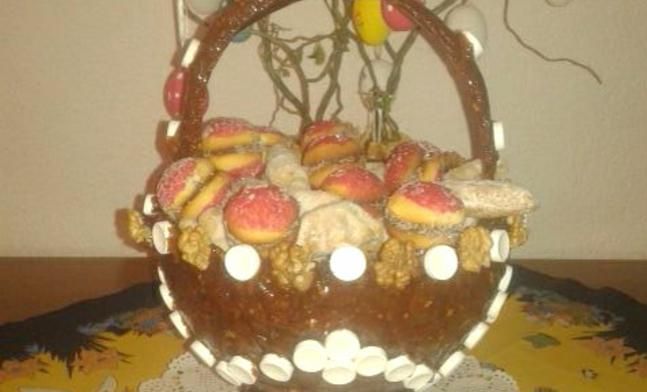 Vještim rukama od vrućeg šećera s orasima Saša zadivljujućom brzinom izrađuje košarice, koje s ručkama budu visoke i do 40 centimetara, a dok je još vruća, torta se ukrašava sitnim (bijelim) bombonima, čiji oblici podsjećaju na dugmad. Kada se na kraju napuni sitnim kolačićima i cvijećem, torta postaje ukras na svakom stolu.