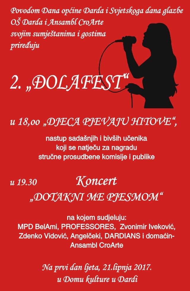 Uz Svjetski dan glazbe, Osnovna škola Drada i Ansambl Cro su za sumještane i njihove goste pripremili 2. Đolafest, na kome će u 18 sati nastupiti bivši i sadašnji učenici Osnovne škole u Dardi u sklopu priredbe Djeca pjevaju hitove i natječu se za nagrade publike i stručne prosudbene komisije.