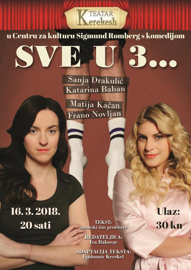 BELIŠĆE Centar za kulturu Sigmund Romberg poziva Vas na fantastičnu komediju varaždinskog Kerekesh Teatra “Sve u 3...” u petak, 16. ožujka 2018. godine, s početkom u 20 sati u dvorani Centra za kulturu Sigmund Romberg.