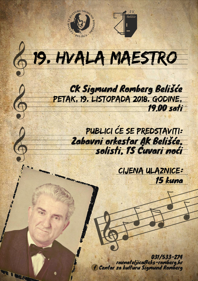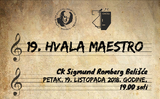 BELIŠĆE U petak, 19. listopada 2018. godine s početkom u 19.00 sati, u dvorani Centra za kulturu Sigmund Romberg održat će se 19. glazbeni program “Hvala maestro” u organizaciji Amaterskog kazališta Belišće i Centra za kulturu Sigmund Romberg.