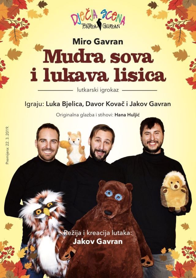 Sa željom da približe kazalište i najmlađoj publici, Teatar Gavran iz Zagreba pokrenuo je i Dječju scenu Teatra Gavran, koja je u godinu i pol realizirala čak tri predstave za najmlađe, od kojih je najnovija je lutkarski igrokaz “Mudra sova i lukava lisica”. Autor lutaka i redatelj predstave je magistar glume i lutkarstva Jakov Gavran, dok je originalnu glazbu skladala Hana Huljić. U predstavi glume diplomirani glumci – lutkari Luka Bjelica i Davor Kovač, a dramaturg je sveučilišni profesor i doktor lutkarstva Hrvoje Seršić.