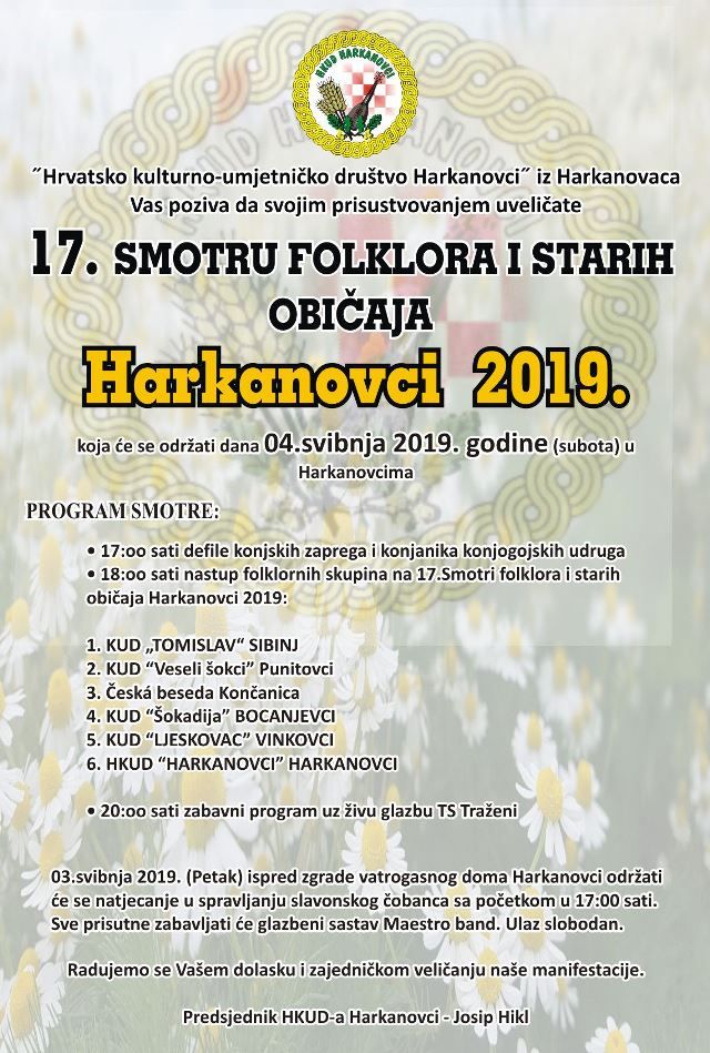 HARKANOVCI Upravni odbor Hrvatskog kulturno-umjetničkog društva Harkanovci, organizira folklornu manifestaciju ˝17.Smotra folklora i starih običaja Harkanovci 2019.˝, a ujedno i natjecanje u spravljanju slavonskog čobanca.