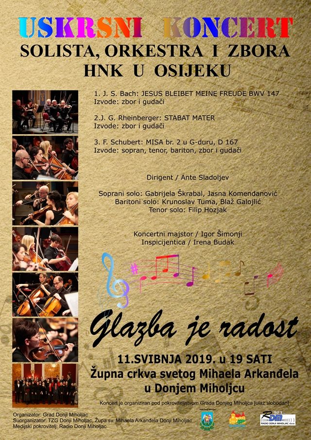 DONJI MIHOLJAC Grad Donji Miholjac u suradnji s Turističkom zajednicom Donji Miholjac i Župom Sv. Mihaela Arkanđela Donji Miholjac organizatori su Uskrsnog koncerta solista, orkestra i zbora HNK-a iz Osijeka.