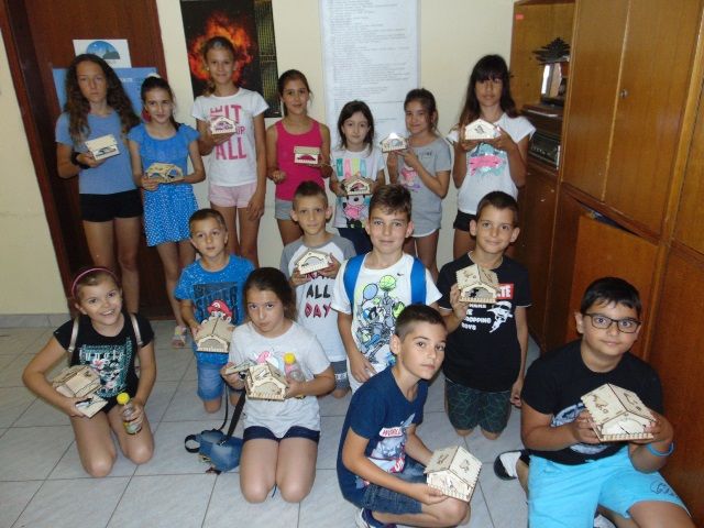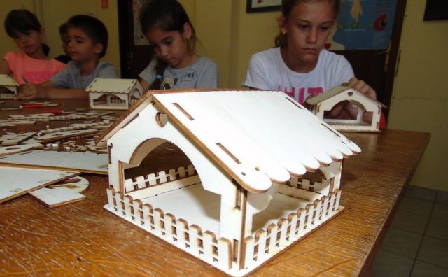 Zadatak: sastaviti kućicu za ptice (stiliziranu), polijepiti spojeve i ukrasiti ju izrezanim elementima od šperploče. Nakon toga dolazi dio izrade spoja od nosača AA baterija, žica sa improviziranim prekidačem i led diodice. Sve treba staviti u kućicu i pričvrstiti vrućim ljepilom.
