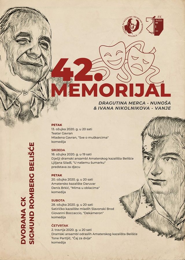 BELIŠĆE U petak, 13. ožujka 2020. godine, u dvorani Centra za kulturu Sigmund Romberg Belišće, u organizaciji Centra za kulturu Sigmund Romberg i Amaterskog kazališta Belišće, započinje tradicionalni 42. Memorijal Dragutina Merca Nunoša i Ivana Nikolnikova Vanje.