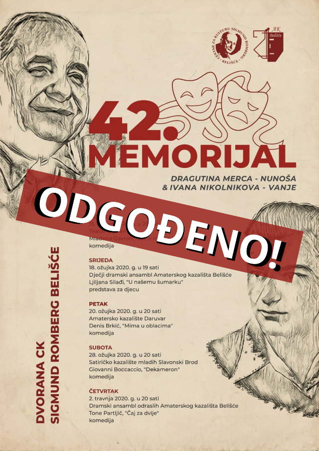 BELIŠĆE Ljubitelje kazališta i vjerne posjetitelje Centra za kulturu Sigmund Romberg, obavještavamo da su programi najavljeni za 42. memorijal Dragutina Merca Nunoša i Ivana Nikolnikova Vanje otkazani do 1. travnja 2020. g.