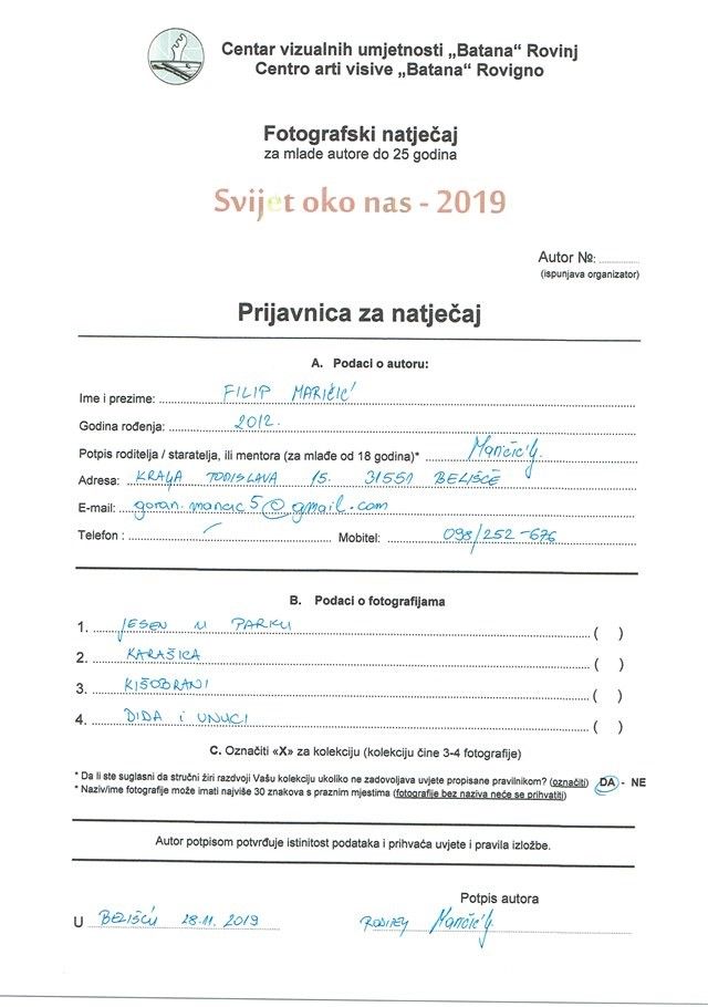 Pozivu su se odazvali i na Natječaj svoje uratke poslali mladi članovi udruge za kulturu i umjetnost „ZUM“ Belišće, Lovro (rođen 2009. godine) i Filip Maričić (rođen 2012. godine) uz mentorstvo Dubravka Maričića, svoga djeda, tajnika Udruge ZUM.