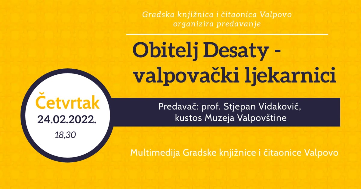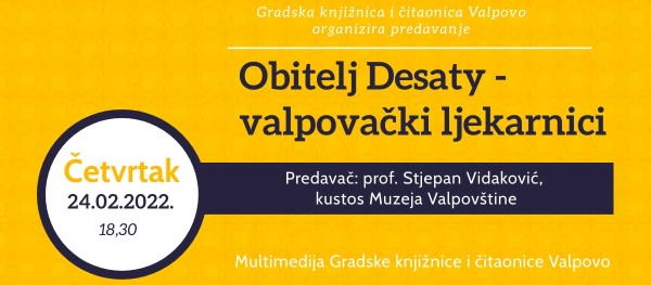 Predavanje je nastavak započete priče o obitelji Desaty koju su građani Valpovštine imali priliku upoznati, a neki i prisjetiti se, početkom prosinca 2021. u Muzeju Valpovštine. Naime, tada je otvorena prva samostalna izložba kustosa Muzeja, prof. Stjepana Vidakovića koji je sinoć u knjižnici nastavio graditi razgovor o ovoj znamenitoj građanskoj valpovačkoj obitelji.