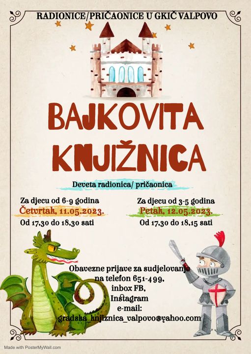 VALPOVO U Gradskoj knjižnici i čitaonici Valpovo, u četvrtak, 11. SVIBNJA 2023.godine, održava se deveta po redu „Bajkovita knjižnica”, radionica/pričaonica za djecu u Dječjem odjelu knjižnice.