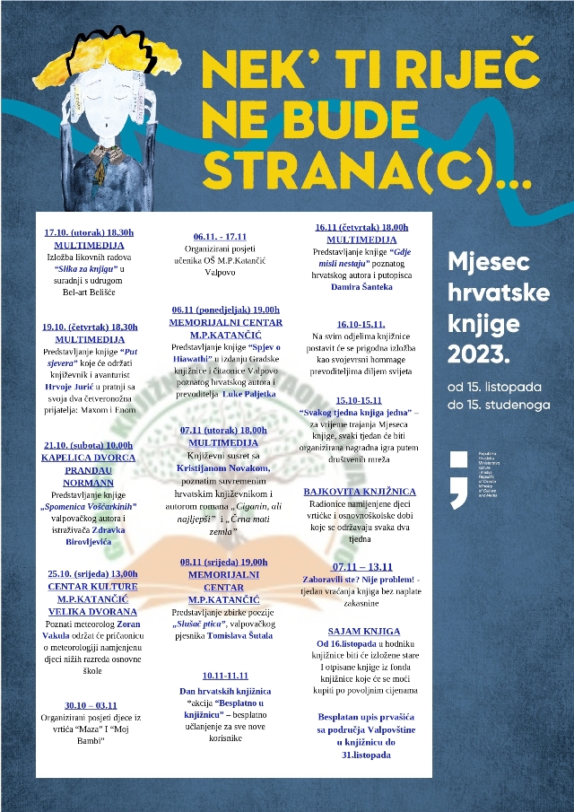 Gradska knjižnica i čitaonica Valpovo također se kontinuirano priključuje u obilježavanju Mjeseca hrvatske knjige i svake godine donosimo bogat i raznovrstan kulturni program za naše sugrađane.