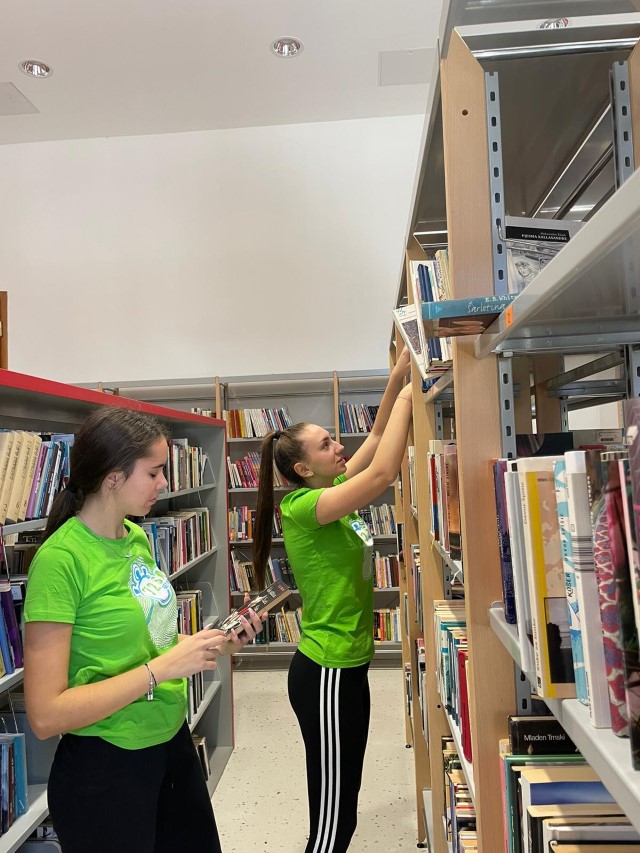 U našoj Knjižnici valpovački srednjoškolci su slagali građu na police, odnosno pomogli pri slaganju naslova za najmlađe po knjižničnim standardima koje su jako brzo razumjeli i primijenili.