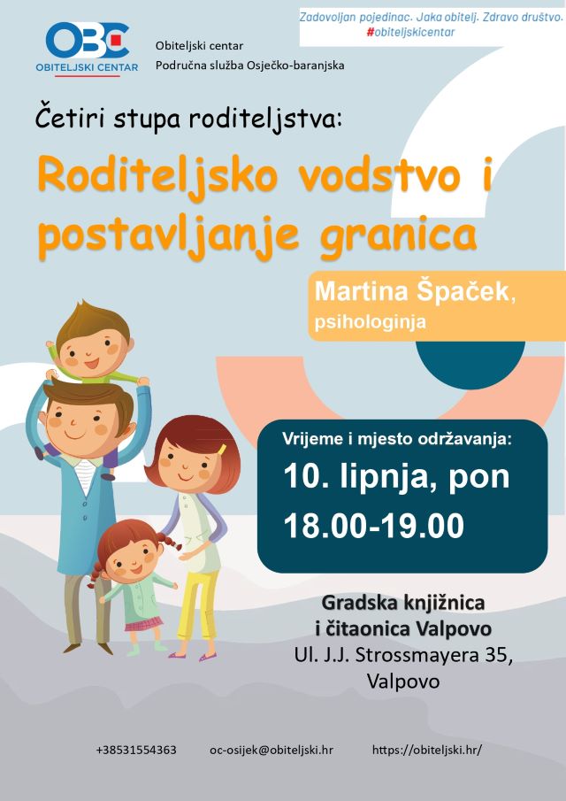 VALPOVO Gradska knjižnica i čitaonica Valpovo, u suradnji s Obiteljskim centrom, Područnom službom Osječko-baranjskom organizira jedno vrlo zanimljivo predavanje namijenjeno prvenstveno roditeljima, ali i svima koji se na neki način bave odgojem djece.