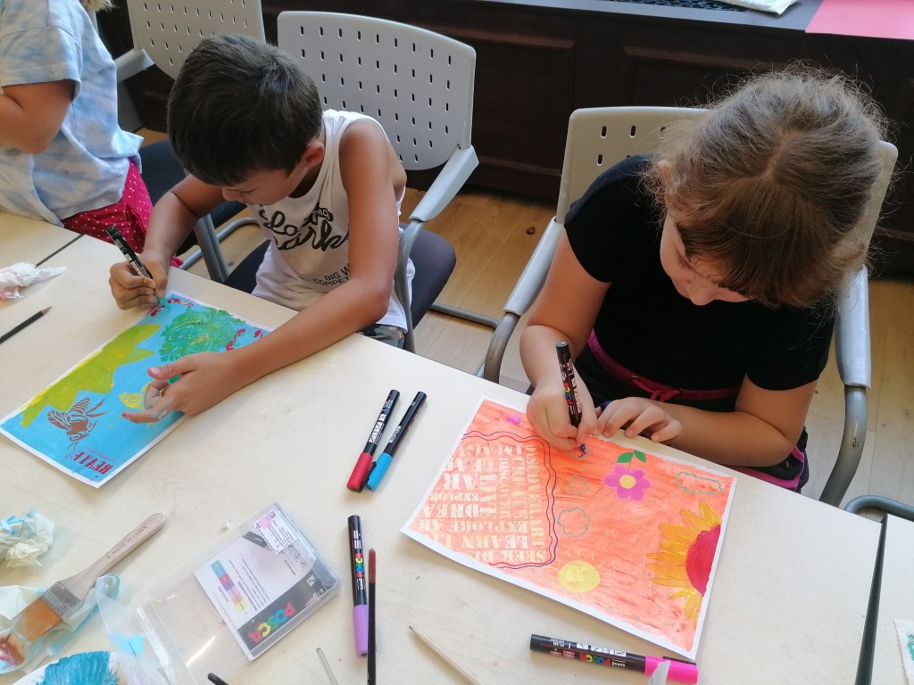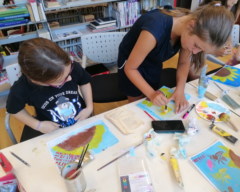 Radionica je bila slikarskog karaktera pa su tako prijavljena djeca dobila priliku okušati su u slikanju suncokreta koji se kao motivi vrlo često javljaju u slikarstvu. Prvo su akrilnim bojama obojili podlogu papira koristeći kistove. Te obojene papire bilo je potrebno dobro posušiti fenovima. Potom su mališani raznim šablonama otisnuli zanimljive uzorke na obojenu podlogu i olovkama skicirali suncokrete koje su obojili žutom i smeđom akrilnom bojom. Za isticanje željenih detalja na suncokretima i dodatno ukrašavanje cijele slike koristili su popularne Posca flomastere.