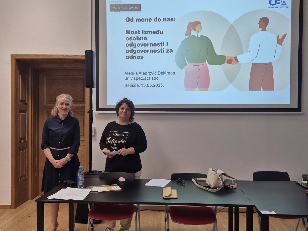 Predavanje pod nazivom „Od mene do nas: Most između osobne odgovornosti i odgovornosti za odnos“ održala je upraviteljica Obiteljskog centra i stručna djelatnica Alenka Aladrović Deklman, sveučilišna specijalistica psihosocijalnog pristupa u socijalnom radu.