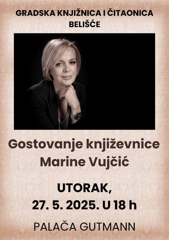 BELIŠĆE Posljednjeg tjedna mjeseca svibnja, točnije, u utorak, 27. 5. 2025. u 18 sati u Palači Gutmann, Gradska knjižnica i čitaonica Belišće ugostit će poznatu i nagrađivanu književnicu Marinu Vujčić.