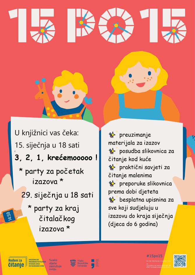 Nacionalni čitalački izazov „15 po 15“ namijenjen je djeci predškolske dobi i svima koji o njima skrbe. Izazov traje od 15. do 29. siječnja 2026., a provodi ga Ministarstvo kulture i medija u sklopu Nacionalnog programa za poticanje čitanja djeci od najranije dobi Rođeni za čitanje. Kampanja Rođeni za čitanje već se treću godinu provodi u Gradskoj knjižnici i čitaonici Belišće, a namijenjena je za sve roditelje, skrbnike, tete, bake, djedove; za sve koji žele čitati djeci, posebice do 6 godina starosti.