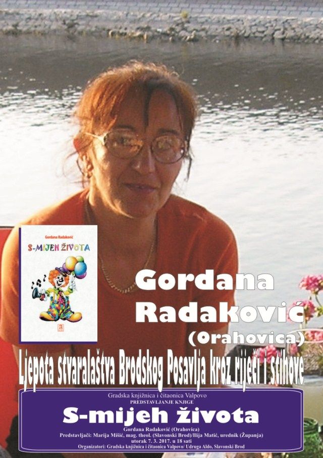 VALPOVO Gradska knjižnica i čitaonica Valpovo i Udruga Aldo iz Slavonskog Broda, povodom Međunarodnog dana žena organiziraju književnu večer, predstavljanje osme knjige orahovačke autorice Gordane Radaković, "S-mijeh života".