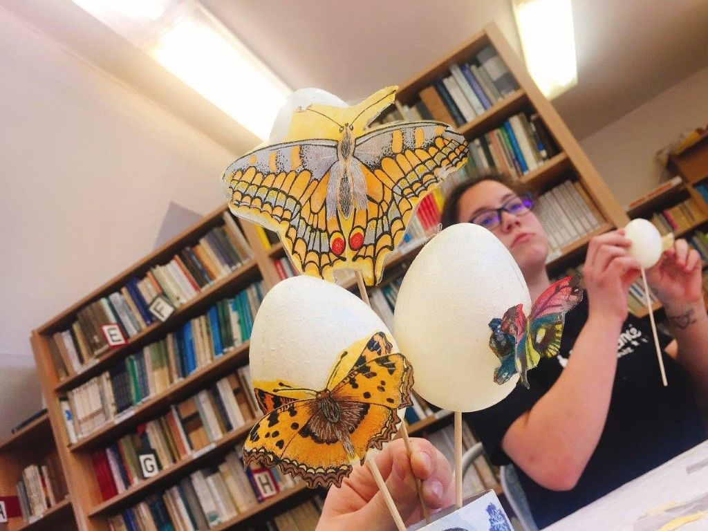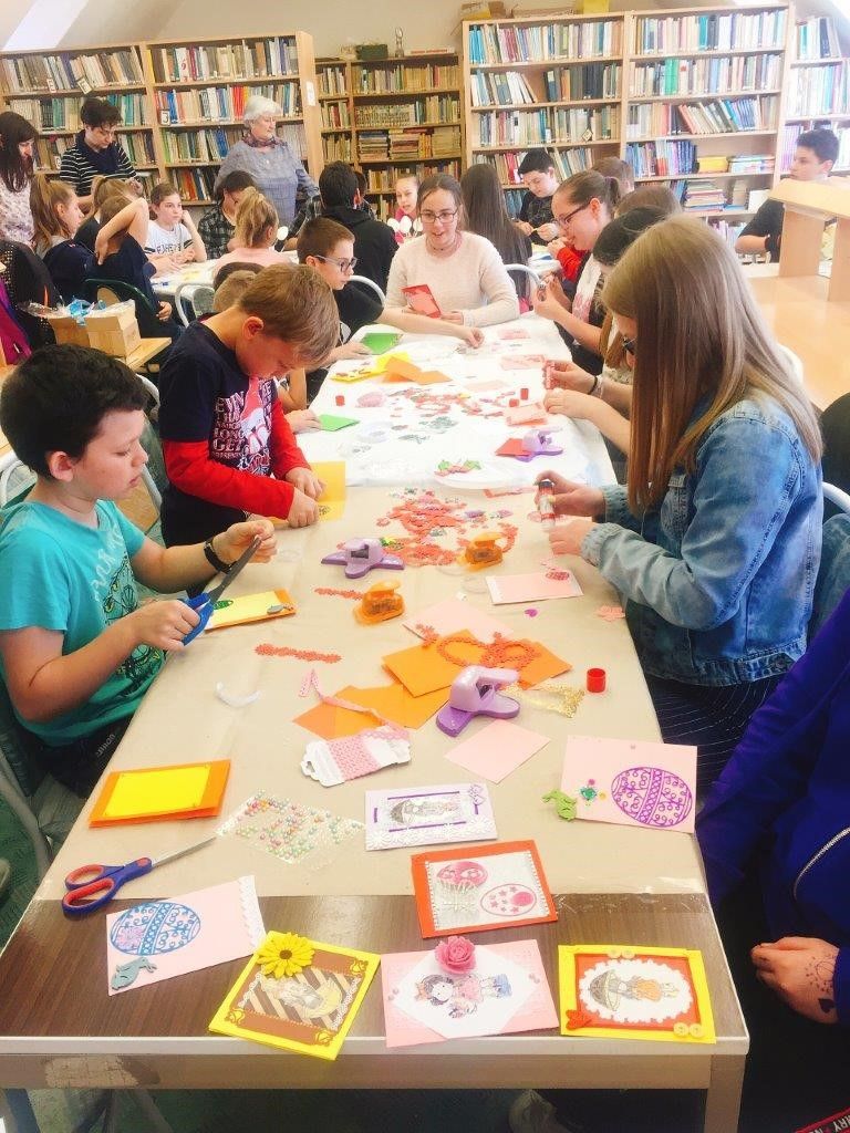 U knjižnici su knjižničarke održale uskrsnu kreativnu radionicu na kojoj su djeca izrađivala uskrsne čestitke i ukrašavala pisanice trodimenzionalnom salvetnom tehnikom.