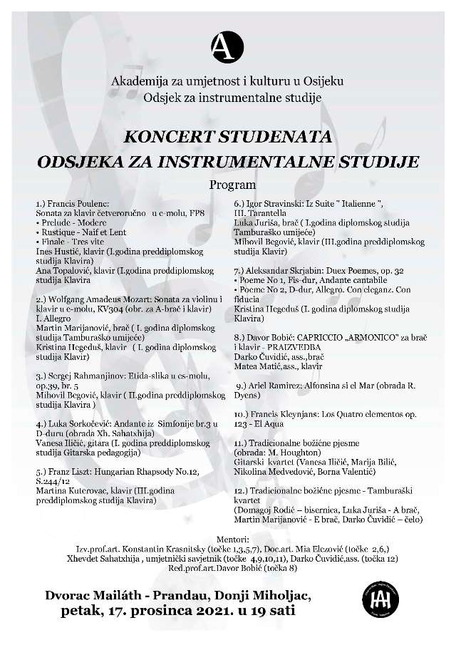 Koncert će se održati 17. prosinca 2021. (petak) u 19,00 sati u DVORCU MAILATH – PRANDAU. Suradnja između ovih dviju obrazovnih ustanova plod je novih kontakata ostvarenih kroz sudjelovanje u organizaciji koncerata Prandau Festivala.