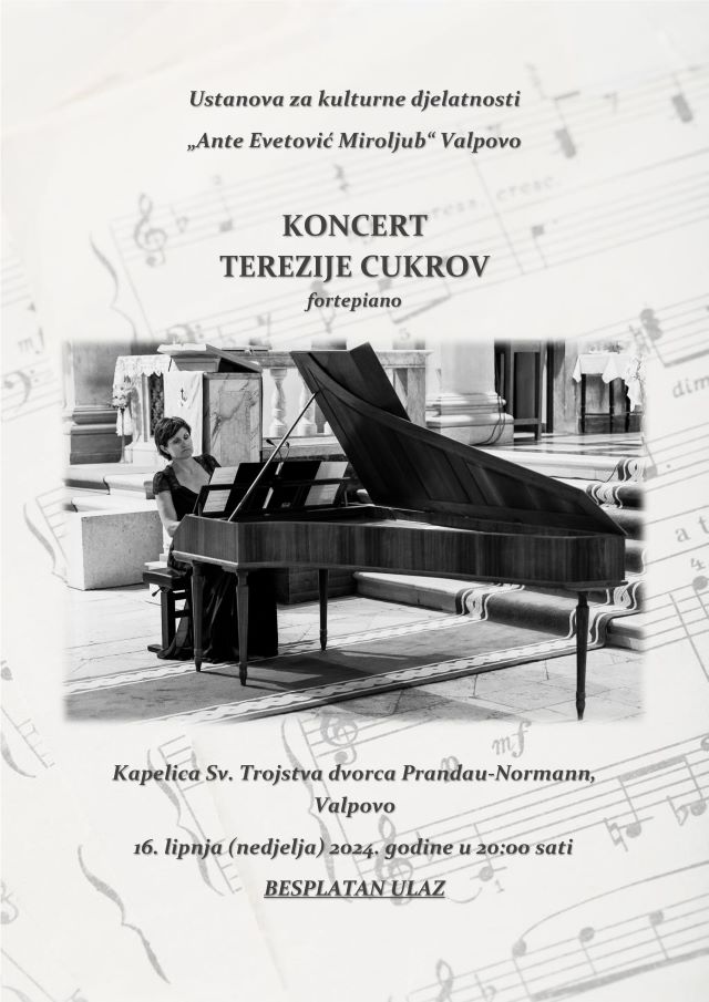 VALPOVO Ustanova za kulturne djelatnosti „Ante Evetović Miroljub“ Valpovo Vam s ponosom donosi: koncert Terezije Cukrov (fortepiano).