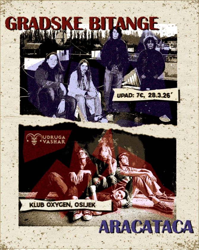 U organizaciji udruge Vashar, u subotu 28. ožujka u Clubu Oxygene nastupit će bendovi Gradske Bitange iz Valpova i Aracataca iz Šibenika.