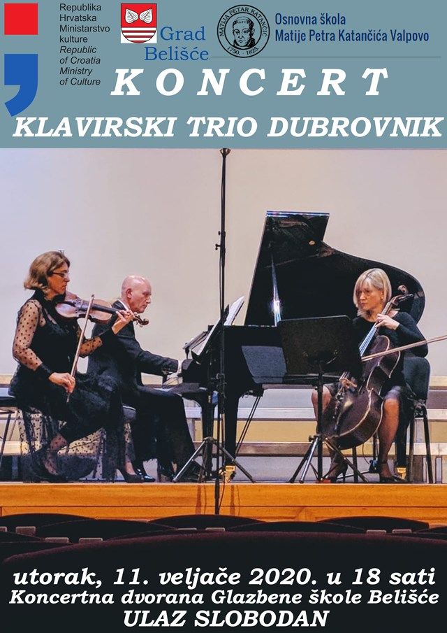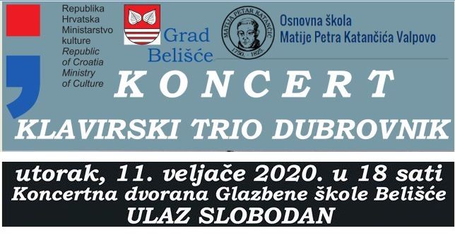 BELIŠĆE Glazbeni odjeli Osnovne škole Matije Petra Katančića u suradnji s Ministarstvom kulture i Gradom Belišće organizira koncert Klavirskog tria Dubrovnik.