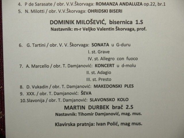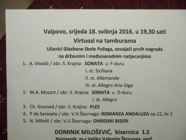U dvorskoj kapelici Sv. Trojstva s početkom u 19:30 sati, koncertom „Virtuozi na tamburi“, učenika Srednje glazbene škole iz Požege, Dominika Miloševića na bisernici, Martina Durbeka na braču i klavirske pratnje Ivana Polića (mag.mus.), zaključen je ovogodišnji program Međunarodnog dana muzeja u Muzeju Valpovštine. Nakon pozdravnih riječi voditeljice Muzeja Mirjane Paušak, ravnatelj Osnovne škole „Matija Petar Katančić“, Valpovo, gospodin Dalibor Košutić, posjetiteljima je predstavio glazbeni program koji je uključivao 10 instrumentalnih skladbi. Osvajači prvih državnih i međunarodnih nagrada na najpoznatijim natjecanjima, Dominik Milošević i Martin Durbek izveli su instrumentalni koncert na opću radost i oduševljenje posjetitelja. Na kraju glazbenog programa, prisutnima se obratio i ravnatelj Srednje glazbene škole iz Požege, gospodin Veljko Valentin Škorvaga te zahvalio domaćinima na gostoprimstvu.