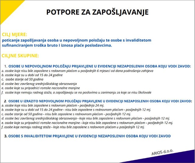 Hrvatski zavod za zapošljavanje radi poticanja zapošljavanja osoba u nepovoljnom i/ ili izrazito nepovoljnom položaju te osoba s invaliditetom, uvodi sufinanciranje troška bruto i iznosa plaće poslodavcima.