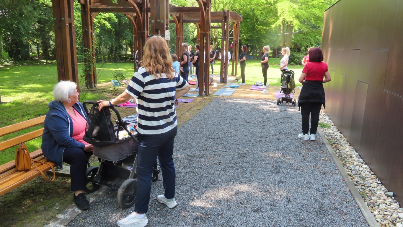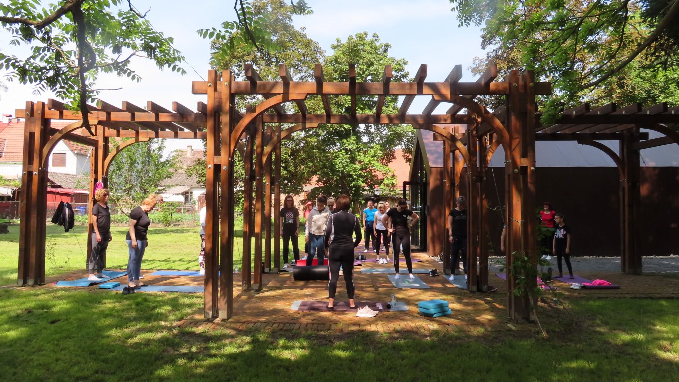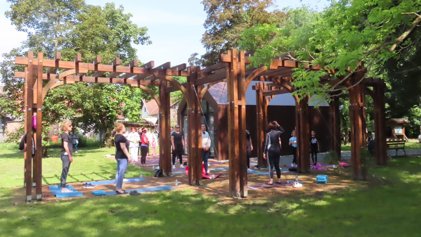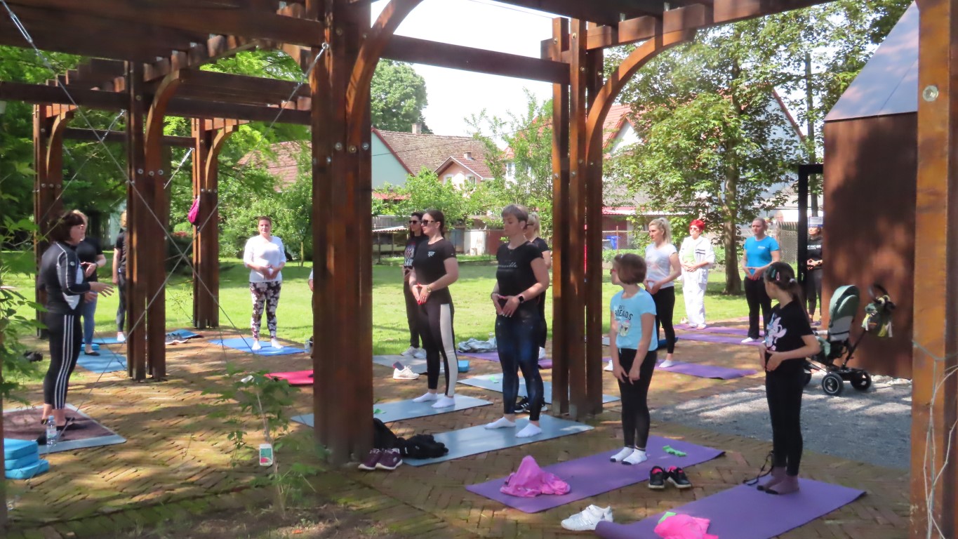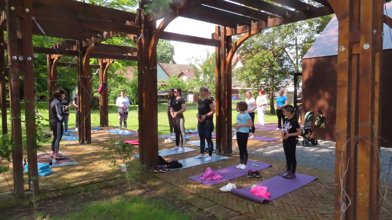 Prostor dvorišta informacijskog centra projekta Parkovni biseri Slavonije pokazao se savršenim za novu namjenu. Hladovit prostor dovoljno velik za sve koji su pokazali htijenje za vježbanjem u prirodi, zelenilo travnjaka, blizina dječjeg igrališta gdje se djeca, također u prirodi, mogu zabaviti čekajući mame dok vježbaju, prikladno odmorište za promatrače vježbanja pod stručnim vodstvom Kristine Mamužić.