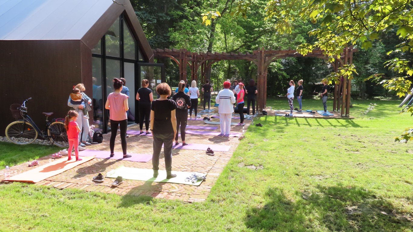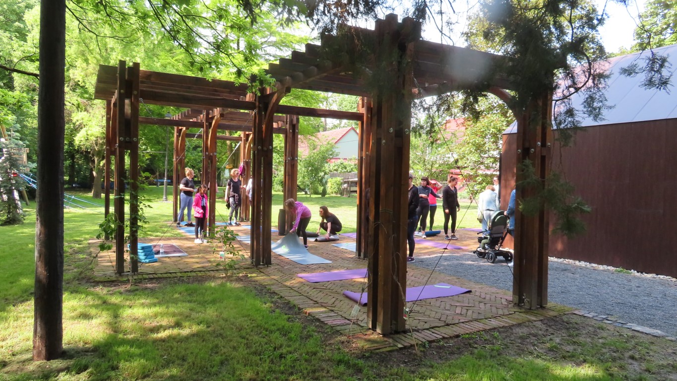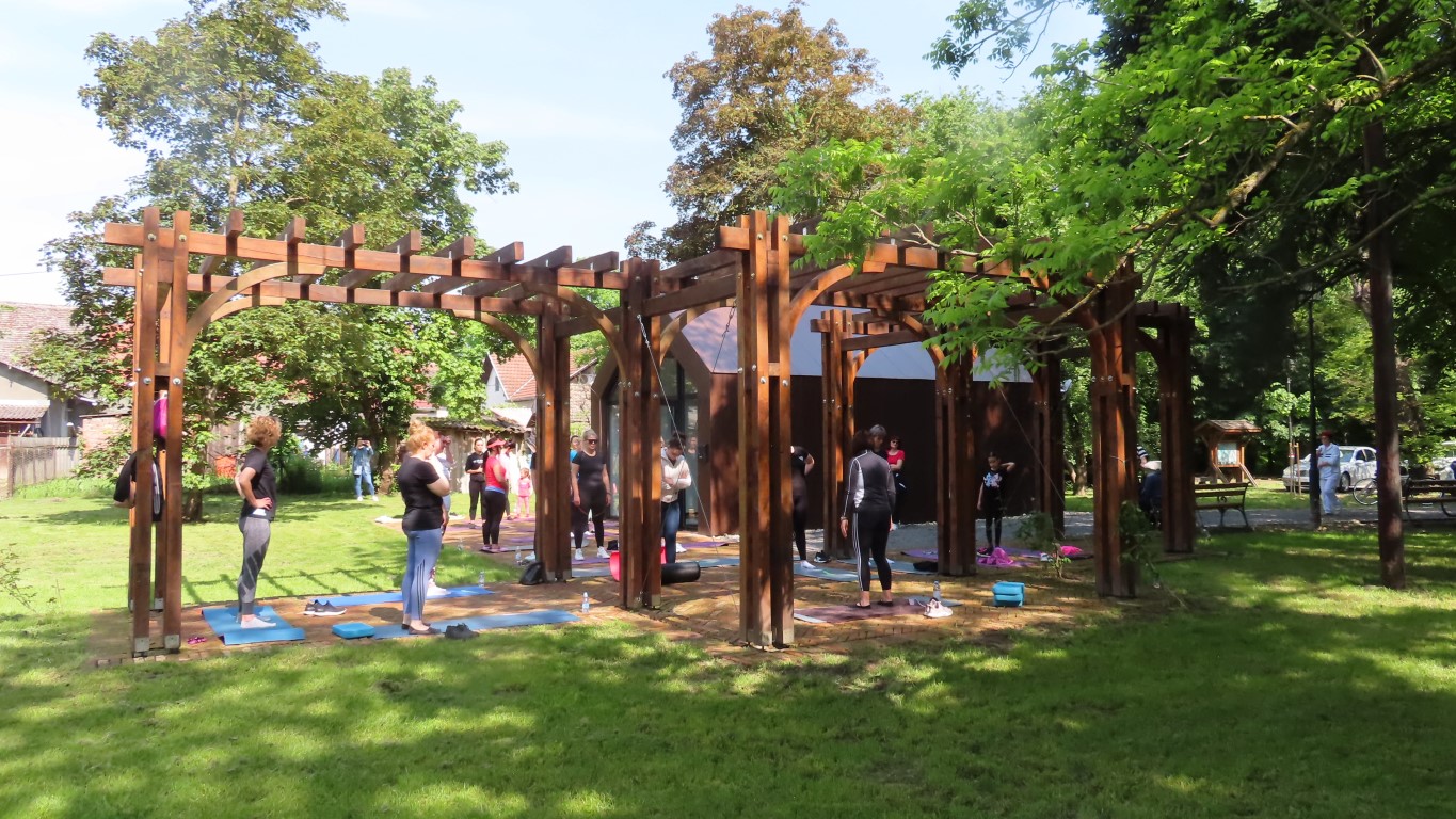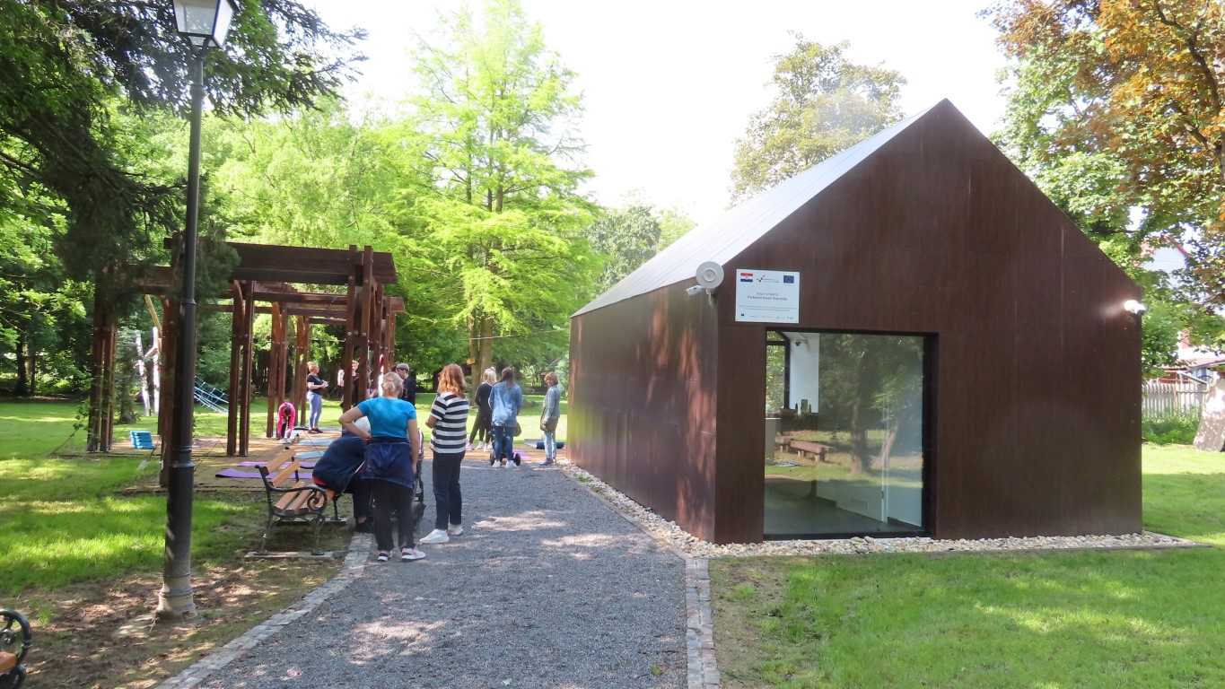 Prostor dvorišta informacijskog centra projekta Parkovni biseri Slavonije pokazao se savršenim za novu namjenu. Hladovit prostor dovoljno velik za sve koji su pokazali htijenje za vježbanjem u prirodi, zelenilo travnjaka, blizina dječjeg igrališta gdje se djeca, također u prirodi, mogu zabaviti čekajući mame dok vježbaju, prikladno odmorište za promatrače vježbanja pod stručnim vodstvom Kristine Mamužić.