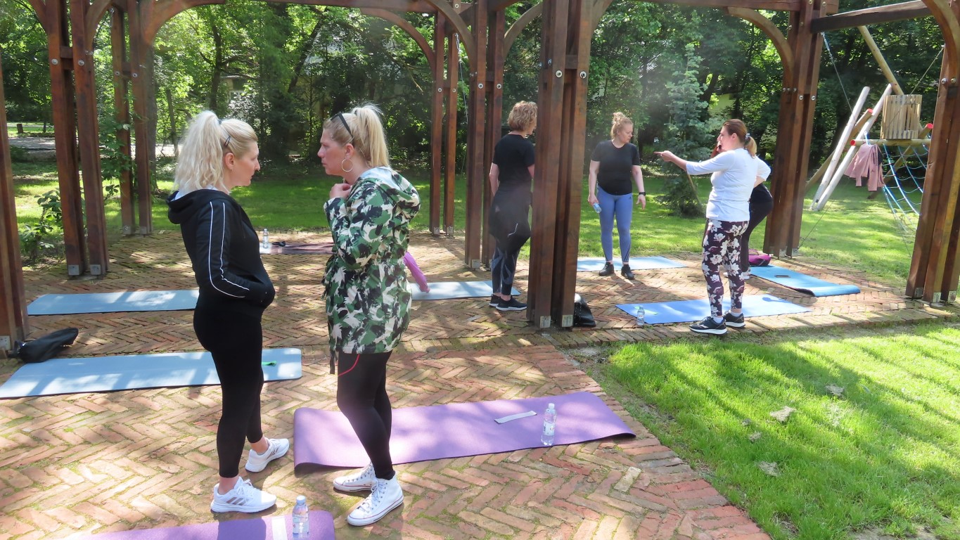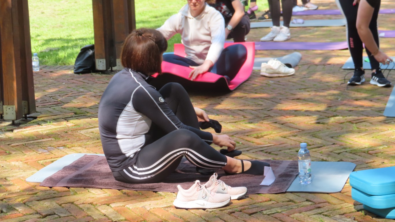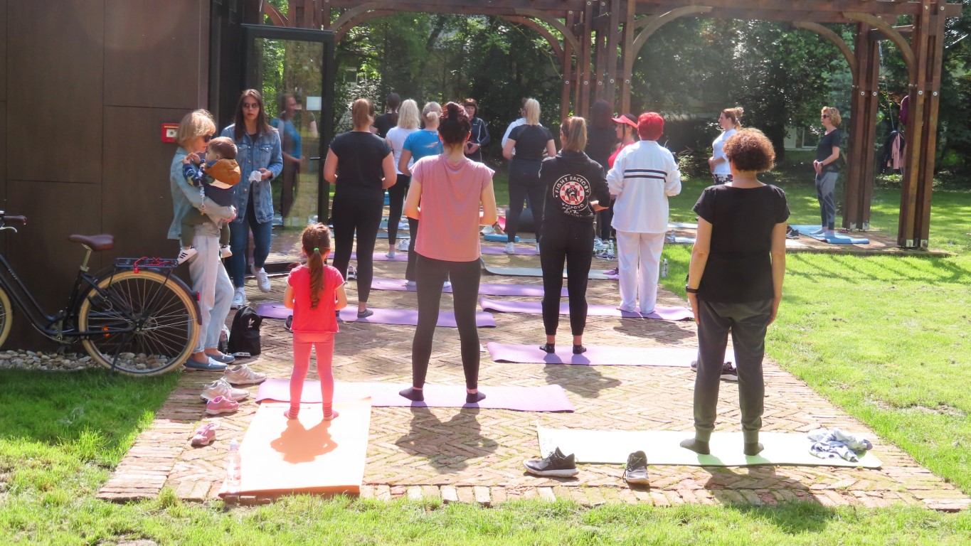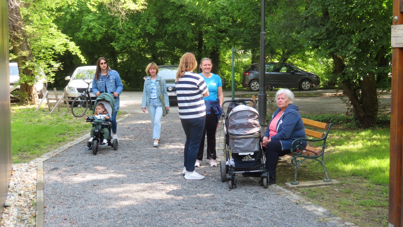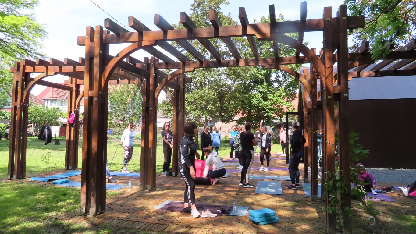 Prostor dvorišta informacijskog centra projekta Parkovni biseri Slavonije pokazao se savršenim za novu namjenu. Hladovit prostor dovoljno velik za sve koji su pokazali htijenje za vježbanjem u prirodi, zelenilo travnjaka, blizina dječjeg igrališta gdje se djeca, također u prirodi, mogu zabaviti čekajući mame dok vježbaju, prikladno odmorište za promatrače vježbanja pod stručnim vodstvom Kristine Mamužić.