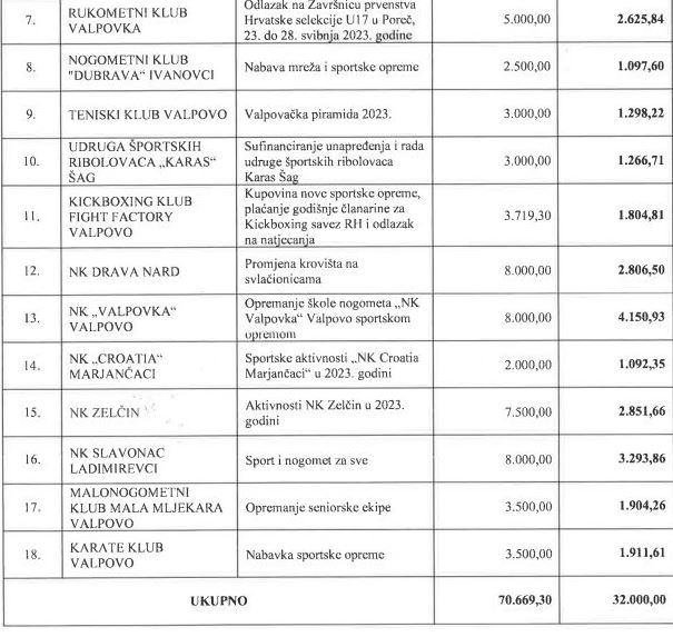 Osamnaest sportskih udruga za provođenje svojih projekata ili programa u ovoj godini imat će na raspolaganju ukupno 32.000 eura, a njihovi su zahtjevi bili viši od 70.000 eura.