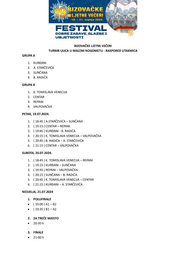 BIZOVAC Organizatori Bizovačkih ljetnih večeri utvrdili su raspored igranja utakmica na Turniru ulica.