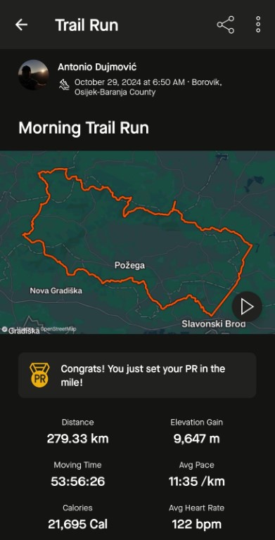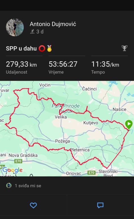 - SPP, prsten slavonskim gorjem za mene je bio san koji sam sanjao sedam godina. Iako s nikad manje treninga, a pogotovo brda, morao sam se naći na startu ove pustolovine. Kako sam nedavno kompletirao naknadni obilazak svih kontrolnih točaka i dobio spomen značku, ovo je bila prilika za drugu. Ipak, jednog dana to sve ostaje mojim blizancima pa da svaki ima po jednu. Uspio sam i beskrajno sam ponosan! Uspjeli smo obići cijeli put i usput postaviti najbrže poznato vrijeme. Sada oporavak i povratak u realnost – ispričao nam je Antonio kako se osjeća nakon ovog postignuća.