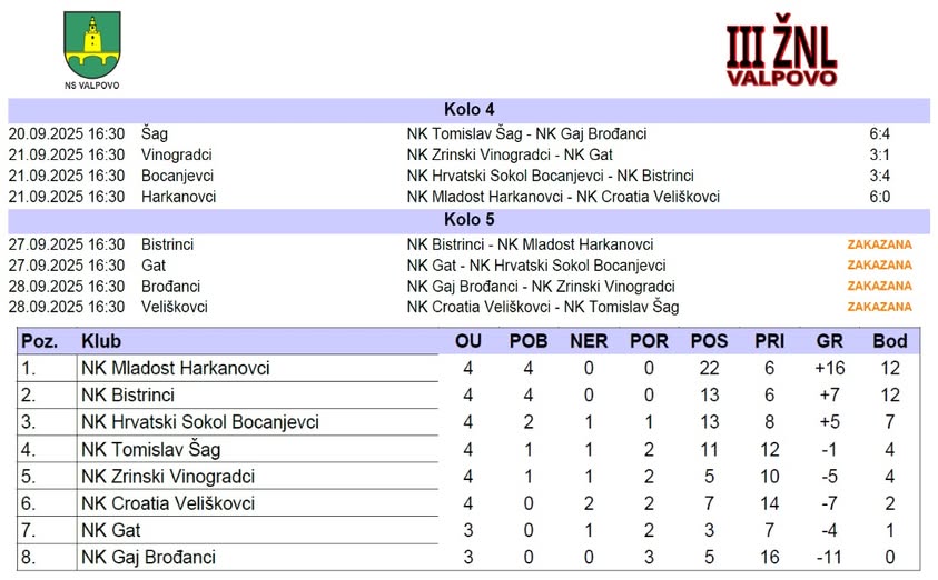 U III ŽNL Valpovo na vrhu ljestvice su Mladost iz Harkanovaca i NK Bistrinci s po 12 bodova