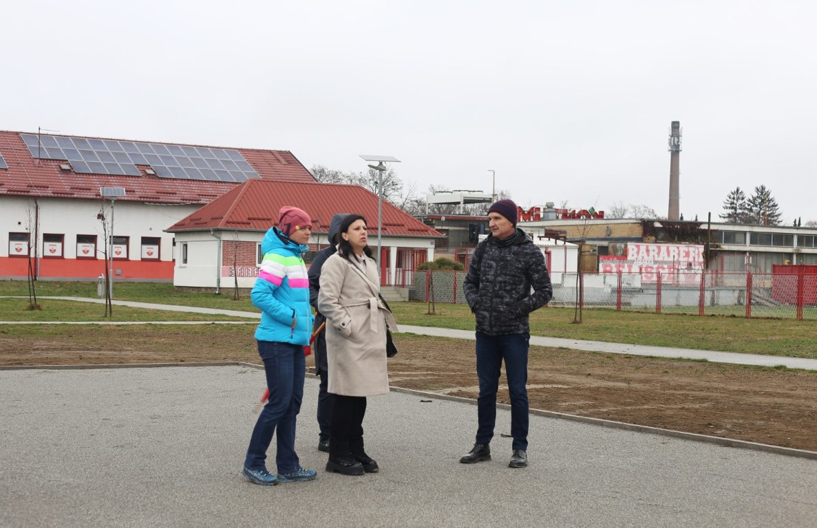 BELIŠĆE Gradonačelnica grada Belišća Ivana Jerbić, danas je, sa svojim suradnicima, obišla radove na izgradnji nogometnog igrališta s umjetnom travom koje se gradi u sklopu gradskog stadiona u Belišću.