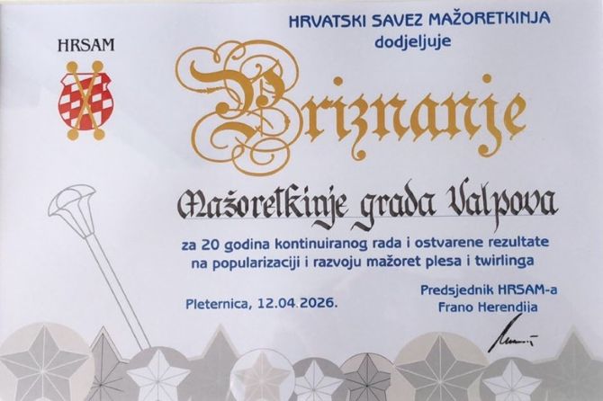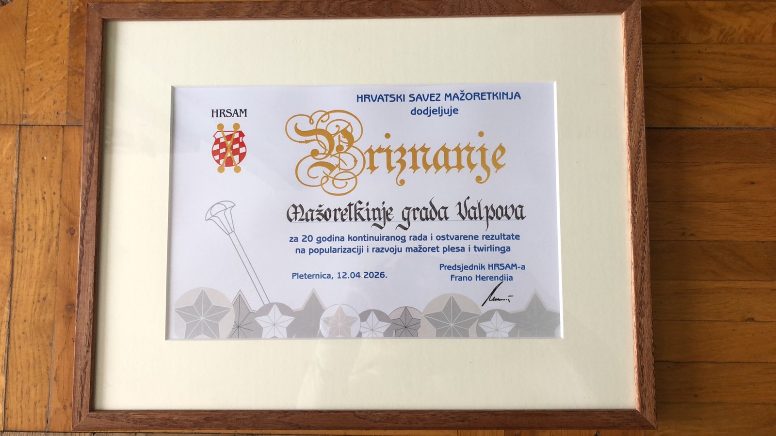 Mažoretkinje grada Valpova u Pleternici su primile i posebno priznanje za 20 godina članstva u HRSAM-u, a preuzela ga je predsjednica Mirela Skelac iz ruku predsjednika Saveza Frane Herendije.