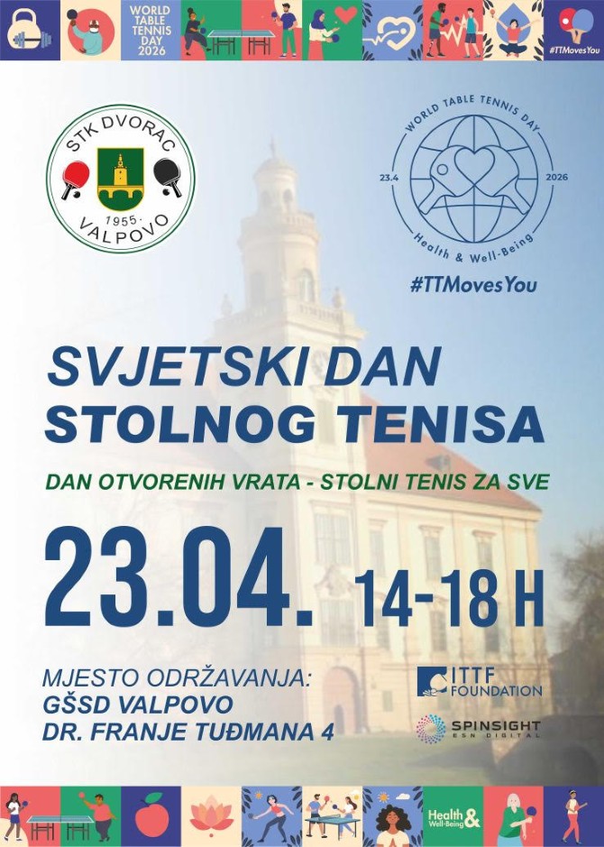VALPOVO U organizaciji Stolnoteniskog kluba Dvorac u Valpovu će se 23. travnja 2026. obilježiti Svjetski dan stolnog tenisa organizacijom Dana otvorenih vrata pod nazivom "Stolni tenis za sve".