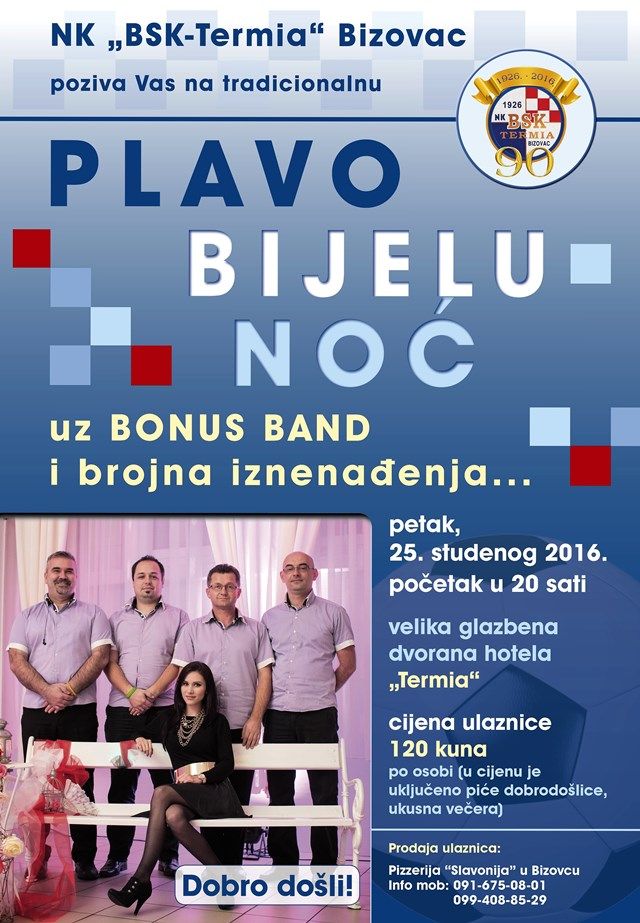 S početkom u 18,30 sati biti će upriličena svečana skupština, a istoga dana od 20,00 sati u velikoj glazbenoj dvorani hotela „Termia“ održati će se tradicionalna zabavna večer pod nazivom Plavo-bijela noć, za koju se ulaznice u slobodnoj prodaji mogu kupiti u bistro-pizzeriji Slavonija u Bizovcu.Za sve detaljnije informacije možete kontaktirati organizatore i to putem mobilnih telefona: 091 675 0801 i 099 408 8529.