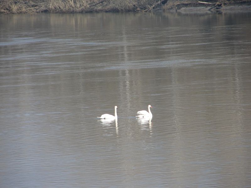 Ostali su nastavili put kroz polje prema šumi i bari Jugovači. Šuma je još bez znakova buđenja, iako ispod lišća stidljivo proviruje poneka visibaba. Bara Jugovača je okovana ledom, i djeluje pomalo tužno bez labudova, a na nekim mjestima su ribolovci probili led. Na odmorištu smo naišli na tragove posjetitelja koji su ga koristili dok mi nismo dolazili. Pogled na Dravu i ovo lijepo mjesto podiže raspoloženje. Dok su jedni pripremali vatru drugi su nastavili put uz Dravu do vodocrpilišta. Tu na Dravi zatičemo par labudova s već odraslim mladuncem, a nedaleko njih velike bijele čaplje veselo se spuštaju na obalu. Gnjurci razigrano uranjaju u hladnu vodu u potrazi za ribom.
