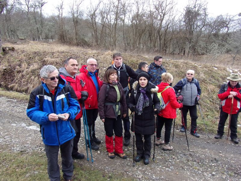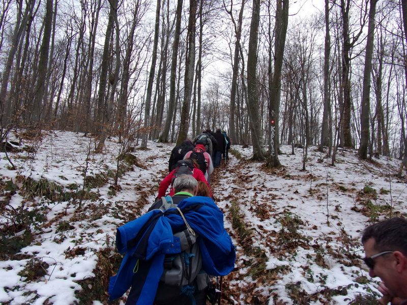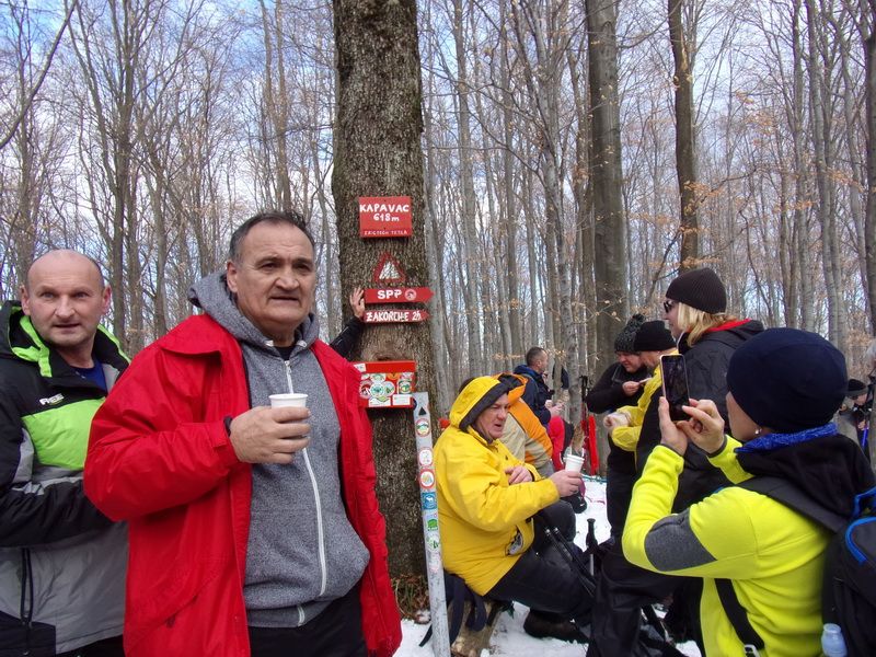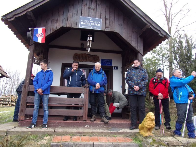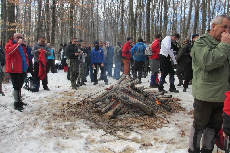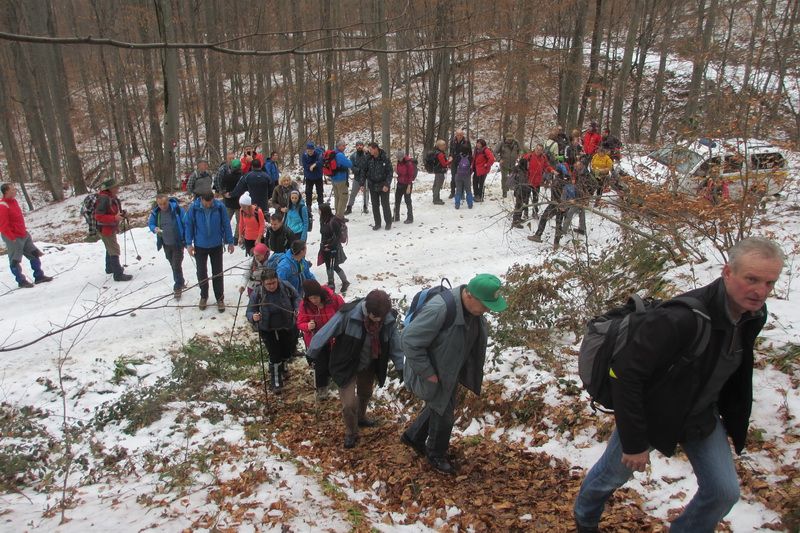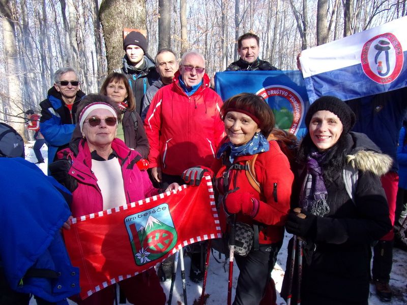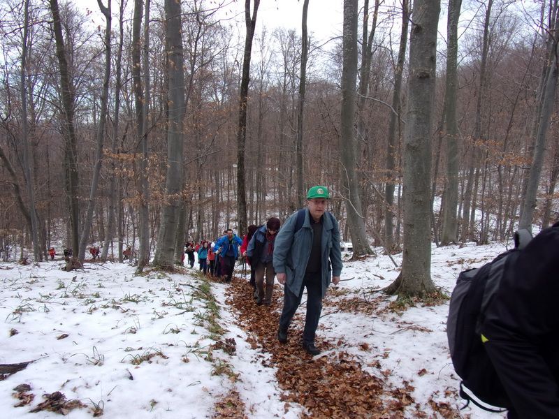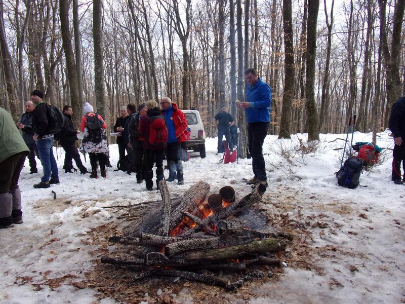 Nakon pozdravne riječi ispred male, lijepo uređene planinarske kuće „Bajin kijer“ u 9,20 sati planinari su u dugoj koloni krenuli na stazu. Vrijeme je bilo u početku oblačno, ali ugodno –primjereno dobu godine. Staza vodi sjevernim obroncima Požeške gore u početku travnata i bez snijega, a kako se krenulo u više predjele, snijeg je postajao sve dublji , a zimska idila sve ljepša. Bilo je puno ugodnih susreta s prijateljima iz drugih društava i u veselom raspoloženju za nešto više od dva sata bili su svi na vrhu. Pojavilo se i sunce i ovdje je uslijedio odmor. Dočekala nas je velika vatra na čistini i topli napitci koje su nam priredili u dogovoru s domaćinima članovi Udruge „Sveti Blaž“ iz obližnjeg sela Tisovac, iz prve susjedne općine Staro Petrovo selo. Nakon ugodnog druženja, fotografiranja sa zastavama kod točke vrha i okrijepe, uslijedio je povratak lakšom stazom. Na početku silaska, kao i na vrhu, bilo je najviše snijega, koji je blistao obasjan sunčevim zrakama, a pogled je bio prelijep i sezao sve do vrha Papuka i jednim dijelom na Psunj.