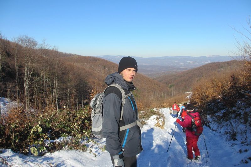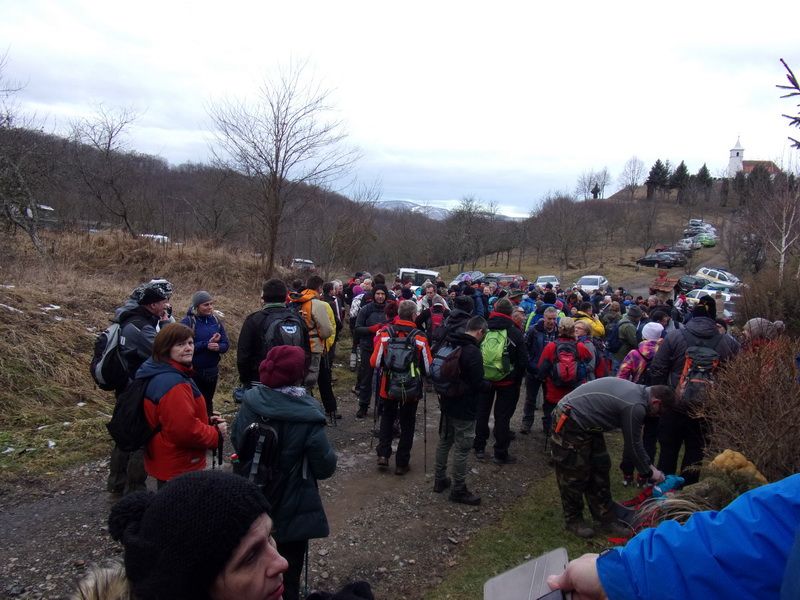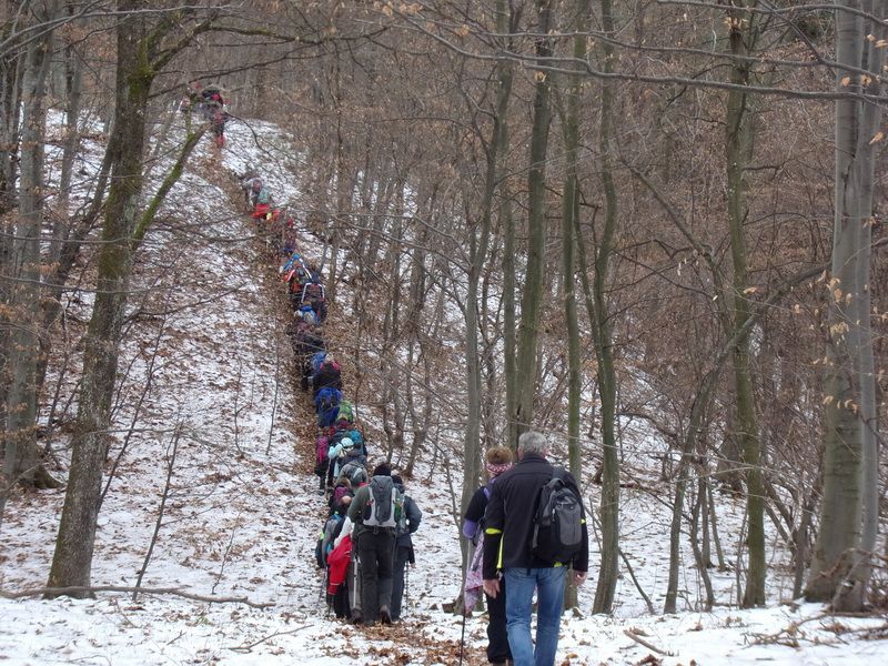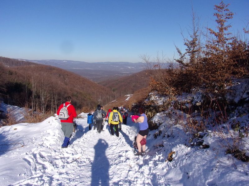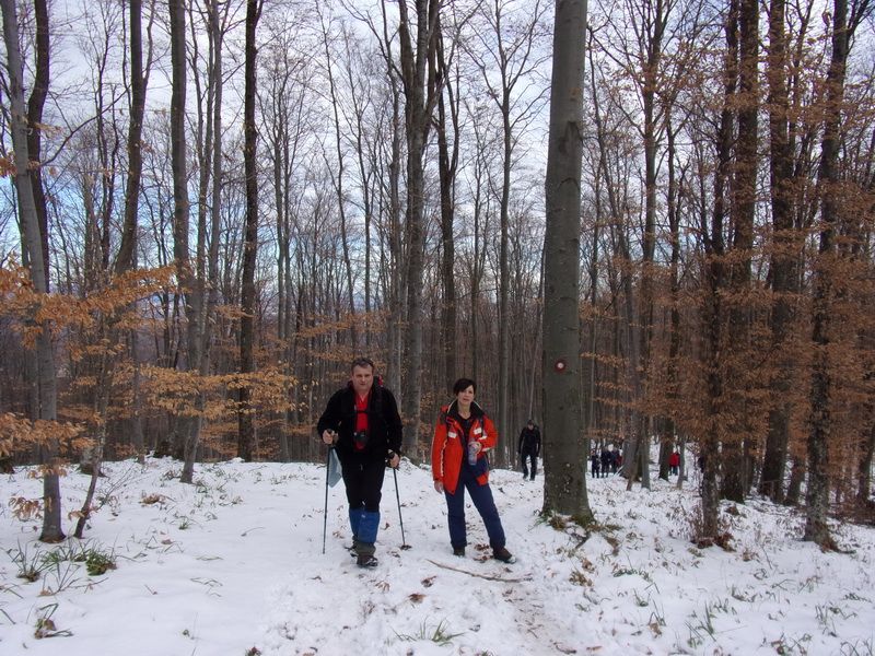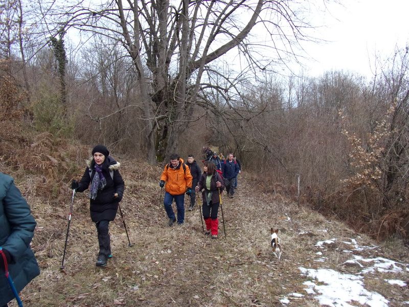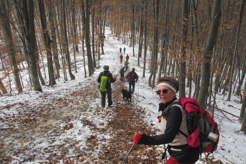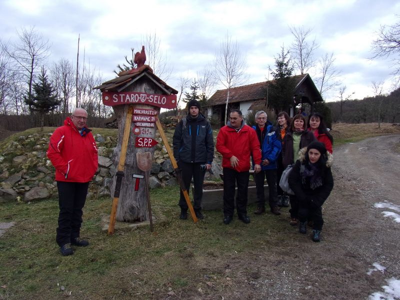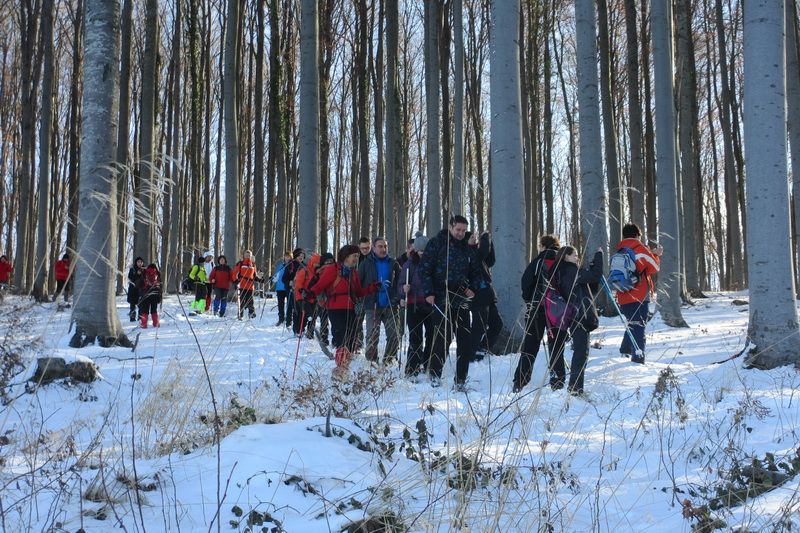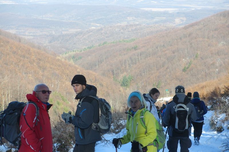 Nakon pozdravne riječi ispred male, lijepo uređene planinarske kuće „Bajin kijer“ u 9,20 sati planinari su u dugoj koloni krenuli na stazu. Vrijeme je bilo u početku oblačno, ali ugodno –primjereno dobu godine. Staza vodi sjevernim obroncima Požeške gore u početku travnata i bez snijega, a kako se krenulo u više predjele, snijeg je postajao sve dublji , a zimska idila sve ljepša. Bilo je puno ugodnih susreta s prijateljima iz drugih društava i u veselom raspoloženju za nešto više od dva sata bili su svi na vrhu. Pojavilo se i sunce i ovdje je uslijedio odmor. Dočekala nas je velika vatra na čistini i topli napitci koje su nam priredili u dogovoru s domaćinima članovi Udruge „Sveti Blaž“ iz obližnjeg sela Tisovac, iz prve susjedne općine Staro Petrovo selo. Nakon ugodnog druženja, fotografiranja sa zastavama kod točke vrha i okrijepe, uslijedio je povratak lakšom stazom. Na početku silaska, kao i na vrhu, bilo je najviše snijega, koji je blistao obasjan sunčevim zrakama, a pogled je bio prelijep i sezao sve do vrha Papuka i jednim dijelom na Psunj.