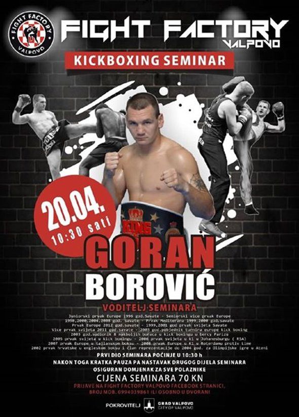 VALPOVO Jedan od najboljih hrvatskih boraca Goran Borović u subotu 20. travnja u Valpovu će održati kickboxing seminar, a domaćin seminara je Fight Factory Valpovo.