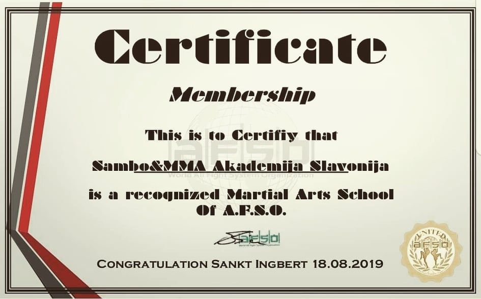 BELIŠĆE Nakon mnoštva zapaženih rezultata na domaćoj i međunarodnoj borilačkoj sceni Sambo&MMA akademija Slavonija je dobila značajno priznanje od velike svjetske borilačke Organizacije A. F. S. O.
