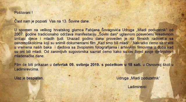 VALPOVŠTINA Udruga „Mladi poduzetnik“ iz Ladimirevaca, od 2007. godine u čast velikana hrvatskog glumišta Fabijana Šovagovića organizira „Šovine dane“.