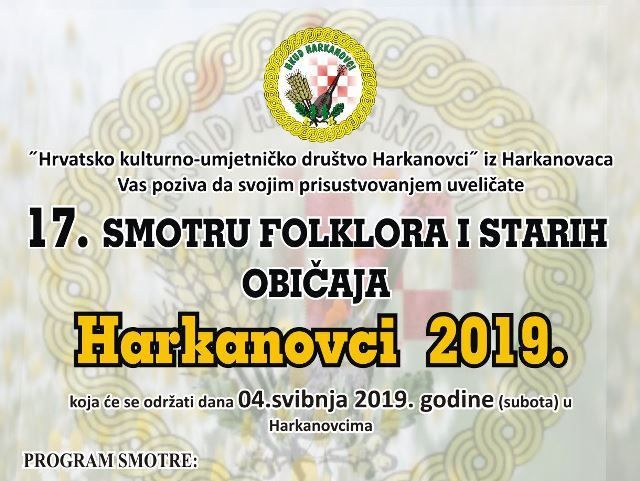 HARKANOVCI Upravni odbor Hrvatskog kulturno-umjetničkog društva Harkanovci, organizira folklornu manifestaciju ˝17.Smotra folklora i starih običaja Harkanovci 2019.˝, a ujedno i natjecanje u spravljanju slavonskog čobanca.