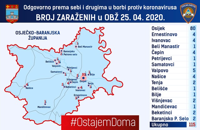 Na području Osječko-baranjske županije tijekom protekla 24 sata testirana je 101 osoba, u Kliničkom bolničkom centru Osijek 87 i u Zavodu za javno zdravstvo Osječko-baranjske županije 14. Svi su testirani uzorci negativni te je i dalje broj oboljelih od koronavirusa na području naše županije 115.